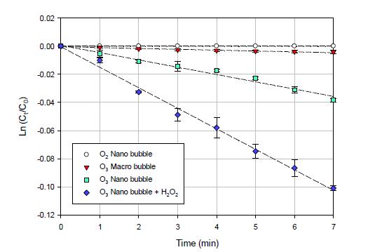 我們可以通過產(chǎn)生納米氣泡來增加氣泡的總表面積。較大的表面積意味著臭氧氣體從氣體轉(zhuǎn)移到水中的可能性更大。因此,我們比較了大臭氧和納米臭氧的臭氧傳質(zhì)(圖1)。從0到7分鐘,納米臭氧氣體向水中的傳輸速率(1.67 mg / L / min)比大型臭氧(0.17 mg / L / min)快9.8倍。由于其在水溶液中的耐久性,納米臭氧濃度的半衰期比大臭氧的半衰期高23倍。使用納米氣泡時,臭氧濃度的半衰期更長,可以用氣泡排斥理論來解釋。納米臭氧可以增強(qiáng)臭氧在水相中的耐久性。由于OH離子的選擇性吸附,納米氣泡在各種pH值下都帶有負(fù)電荷。由于H +(-1127 kJ / mol)的水合焓比OH-(-489 kJ / mol)的水合焓低得多,因此納米氣泡的帶電表面會產(chǎn)生排斥力。這種現(xiàn)象有助于避免氣泡合并。