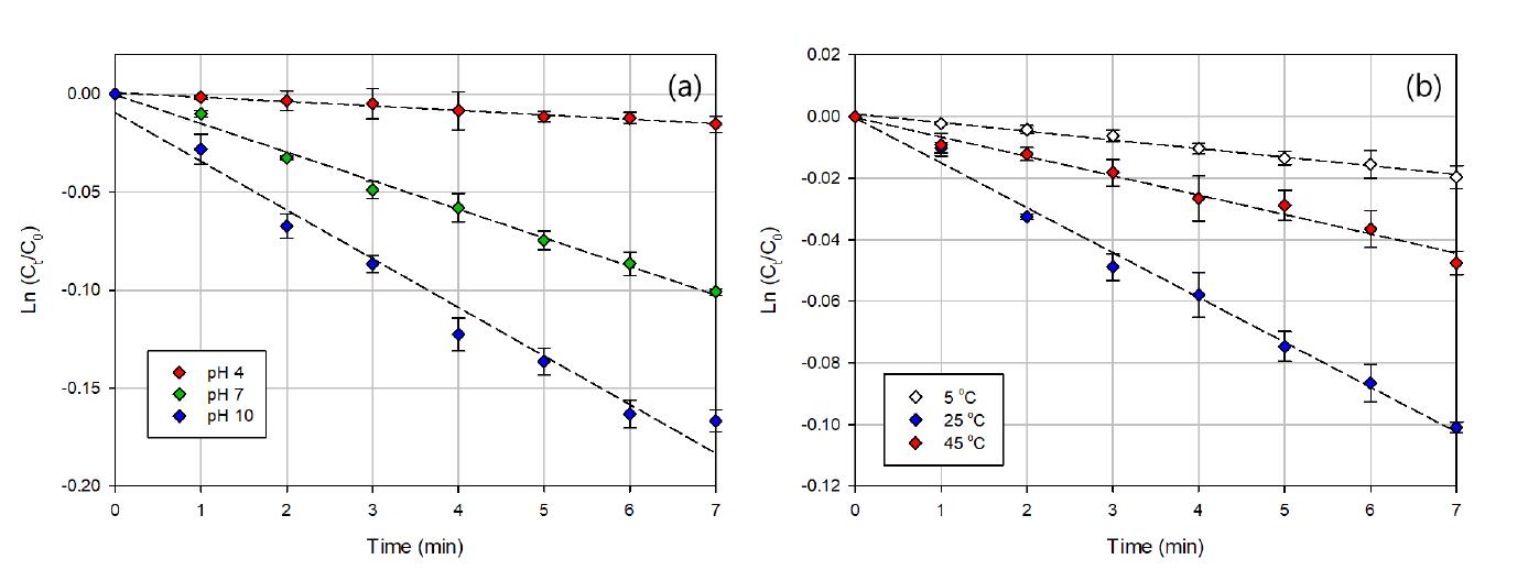 我們在各種pH值下應(yīng)用了納米臭氧/ H2O2反應(yīng)來降解合成廢水中的TMAH(圖3(a))。 TMAH降解的 很佳條件是pH 10(2.48×102 min-1),然后是pH 7(1.46×102 min-1)和pH 4(2.3×103 min-1)(表S3)。據(jù)報道,傳統(tǒng)的臭氧/過氧化氫工藝僅在高pH下才快速。如式(3)所示,在堿性pH條件下的臭氧反應(yīng)過程中,OH-離子可增強(qiáng)•OH的生成。 (8)和等式(9)。在pH 4下,TMAH的去除率 很低。這種現(xiàn)象是由于缺乏OH離子造成的。