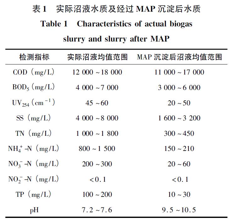 實(shí)驗(yàn)所用厭氧沼液取自陜西省楊凌示范區(qū)某產(chǎn)業(yè)集團(tuán)生豬實(shí)訓(xùn)基地。該場生豬出欄量為18 萬頭/a,豬場廢水主要來自糞尿、豬舍沖洗水,豬場廢水由露天排水溝匯入?yún)捬跽託獬刂校M(jìn)行1 ~ 2 個月厭氧發(fā)酵。厭氧發(fā)酵后的沼液以MgCl2和Na2HPO4為沉淀劑,進(jìn)行MAP 沉淀反應(yīng)前處理。實(shí)際沼液水質(zhì)及經(jīng)過MAP 沉淀后水質(zhì)情況如表1 所示。