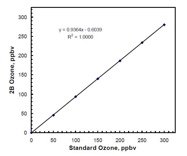 在本例中,校準(zhǔn)參數(shù) S 為 1/0.9364 = 1.068,四舍五入為 1.07。該圖的 y 截距,即方程 y = mx + b 中的 b,在上例中為 -0.6,應(yīng)在臭氧校準(zhǔn)源設(shè)置為零時測量的偏移的 ±2 ppb 范圍內(nèi)。如果不是,則儀器可能存在問題。通常,這表明臭氧監(jiān)測器流路中存在污染。