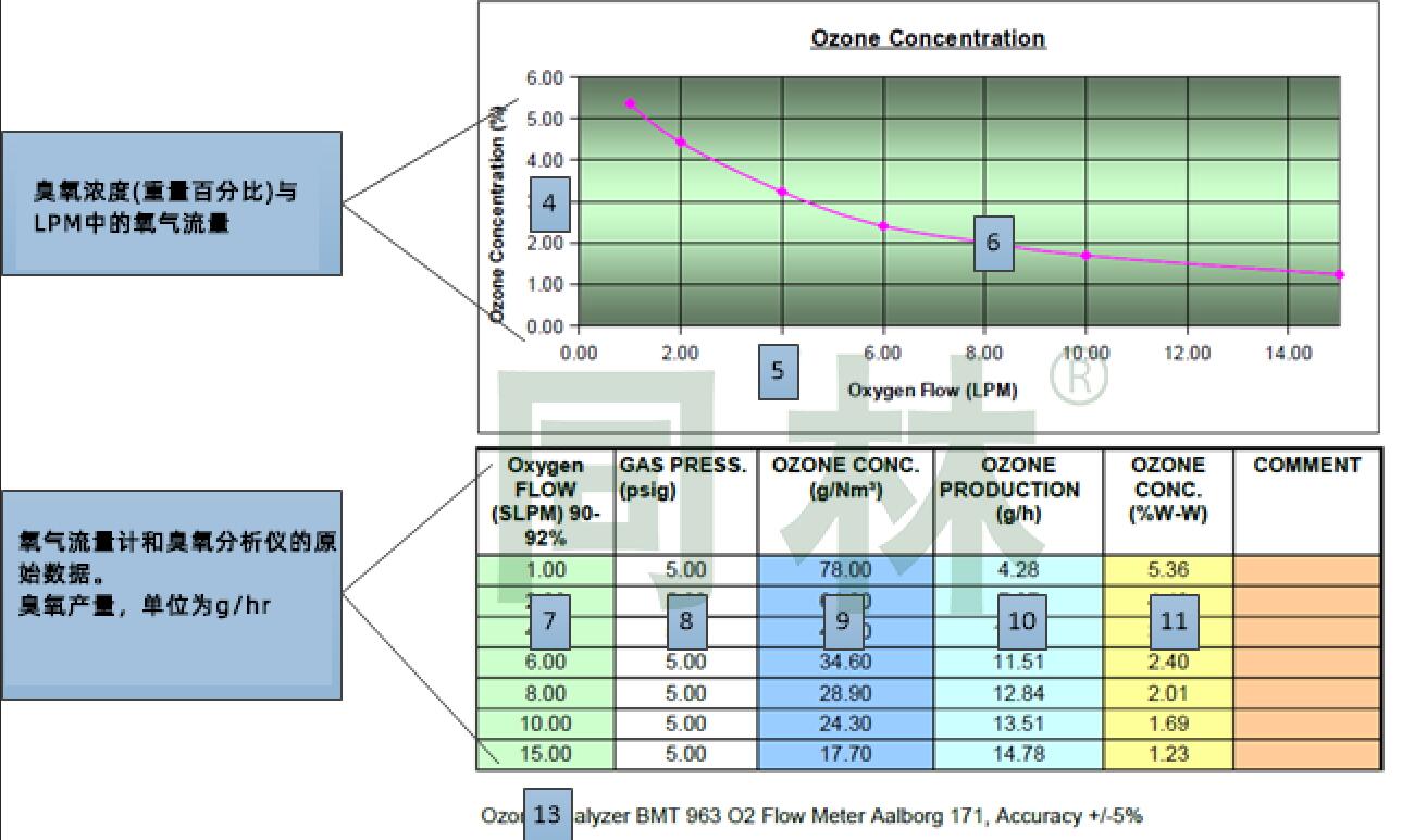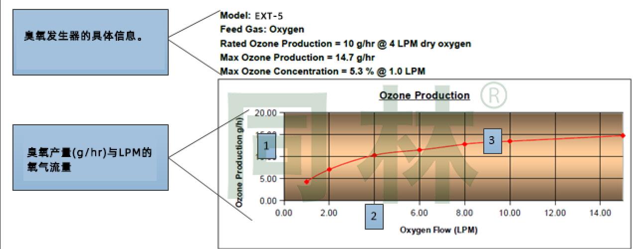 1. 臭氧產(chǎn)量顯示在垂直(Y軸)的圖形上,單位為克/小時(shí)或其他臭氧輸出測(cè)量單位