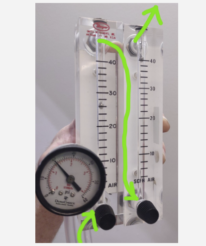 當氣體,無論是空氣還是氧氣,通過流量計加壓時,流量計將讀取不準確的流量。下圖顯示了兩個相同的流量計并排,從氧氣濃縮器流過每個流量計的氧氣量相同。左邊的流量計壓力為20 psi,右邊的流量計壓力為0 psi。盡管流經流量計的氧氣量是相同的,但流量讀數是不同的。在壓力下,流量計的讀數將低于實際流量。