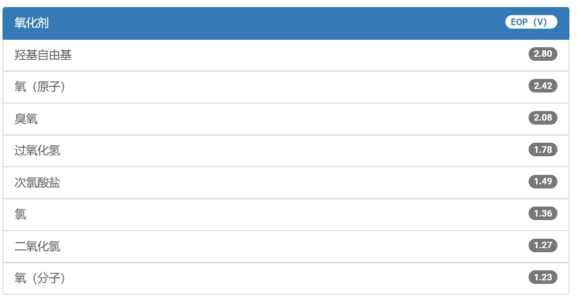 高級(jí)氧化工藝(AOP)結(jié)合了臭氧(O3)、紫外線(UV)、過氧化氫(H2O2))或催化劑提供強(qiáng)力水處理溶液,用于通過COD、BOD或TOC測(cè)量的殘余有機(jī)化合物的還原(去除)。所有AOP都設(shè)計(jì)用于產(chǎn)生羥基自由基,正是羥基自由基高效地破壞有機(jī)化合物。下圖顯示了羥基自由基與其他氧化劑的氧化能力。